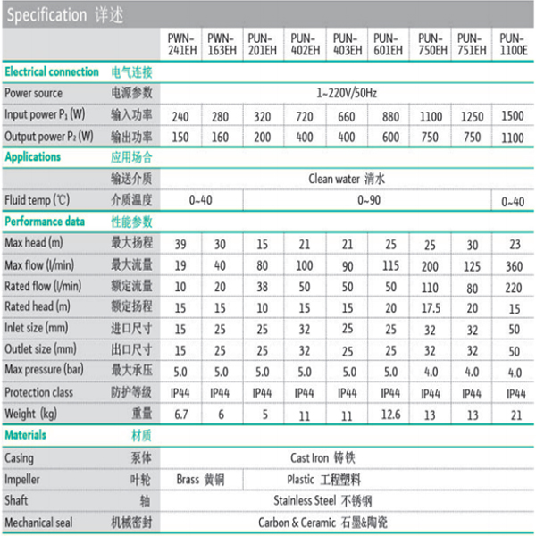 離心泵PUN-750EH◆·離心式葉輪。◆·結(jié)構(gòu)緊湊,易安裝,易維護(hù)。◆·各種機(jī)床配套。◆·家庭,花園供水。◆·小型暖通空調(diào)循環(huán)系統(tǒng),空氣能系統(tǒng)。◆·泵體:鑄鐵。◆·泵軸:不銹鋼。◆·葉輪:工程塑料。◆·機(jī)封:石墨+陶瓷。◆·耐溫:0-90°C